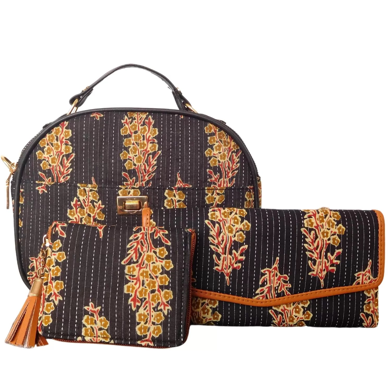 - Material Used – Vegan Leather, Handicraft Fabric, Water-resistant inner lining, Premium accessories.